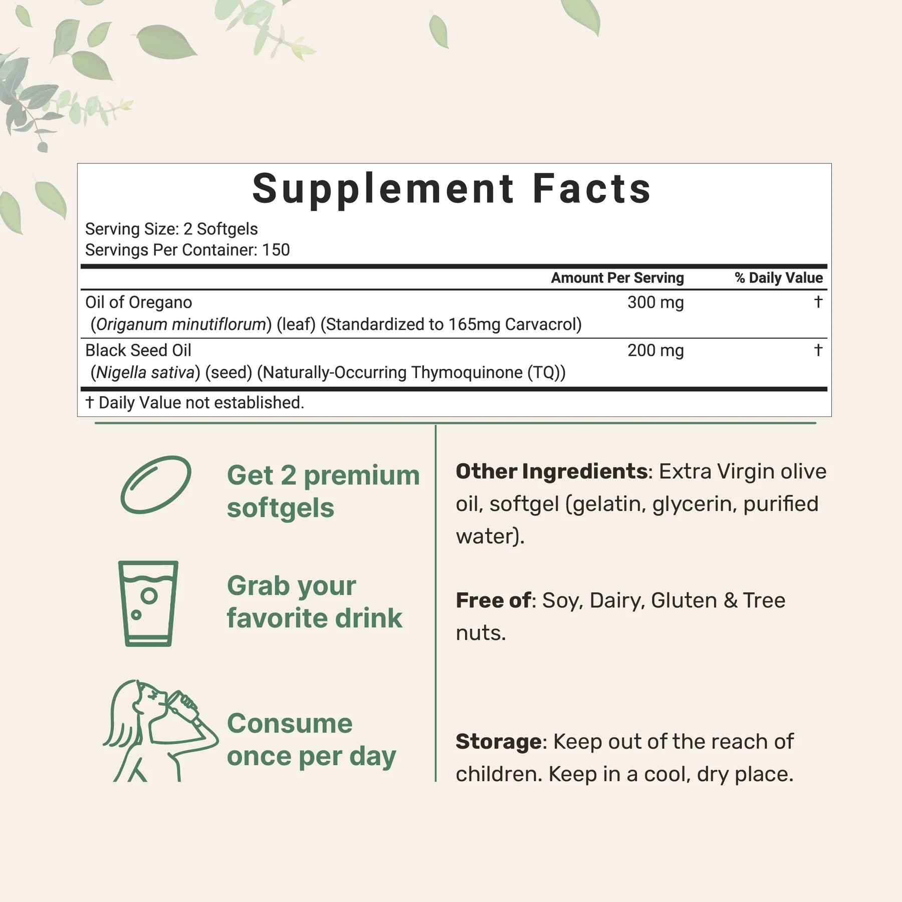 Combines two legendary ingredients: oregano oil (rich in carvacrol) and black seed oil (with natural thymoquinone) in a single capsule for a truly synergistic effect.